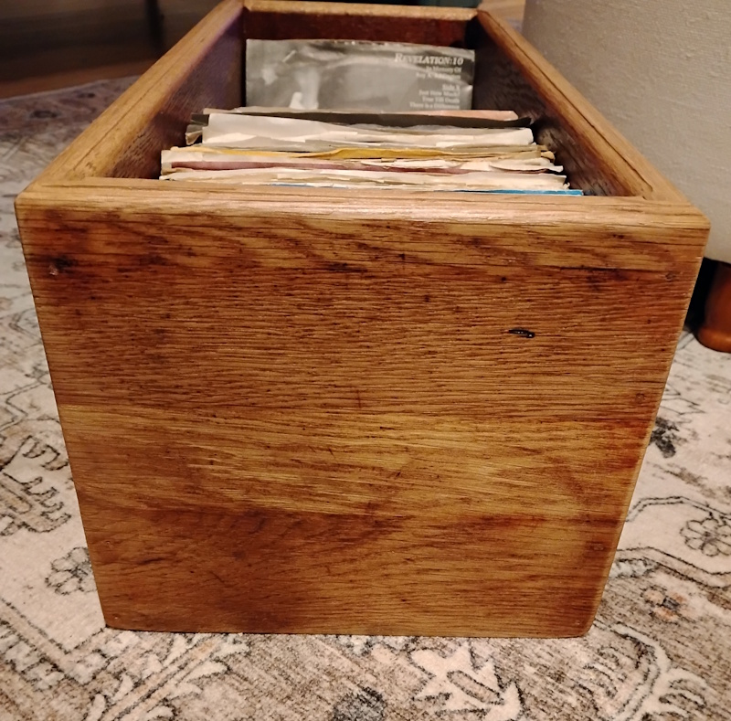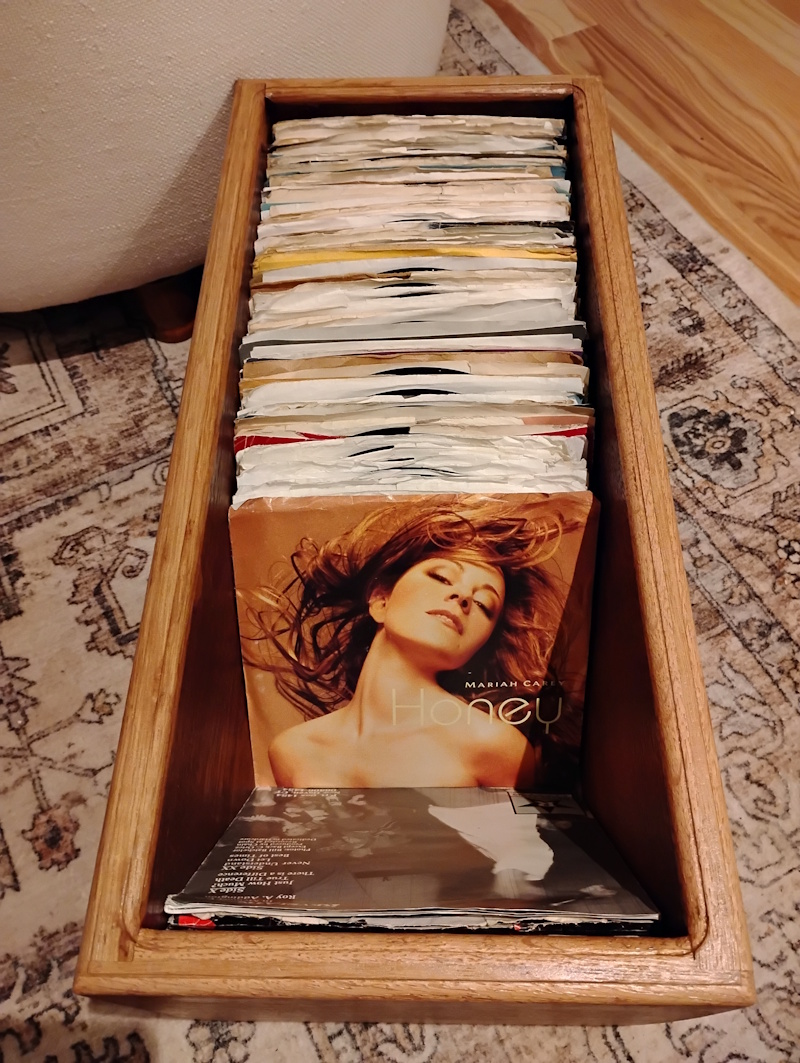 Custom one off fabrication 7″ record box. Fits around 180 45 7″ records. Re-claimed wood shows history with aged patina. Inner width is snug fitting typical 7s and picture sleeve perfectly but does not accommodate the plastic protective sleeved records well.