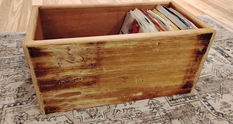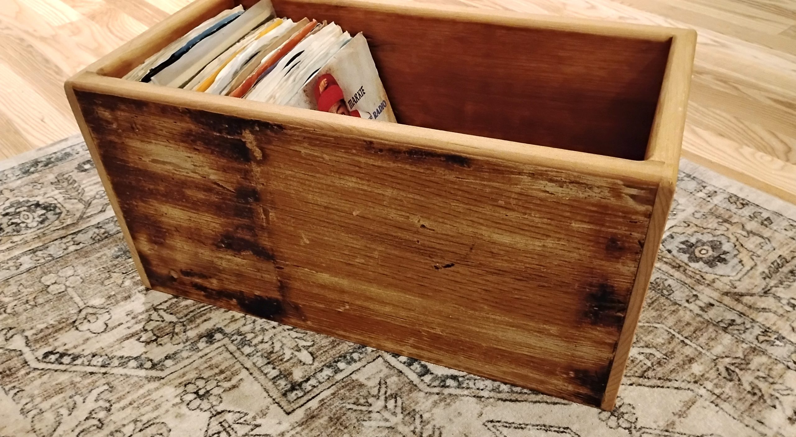 Custom one off fabrication 7″ record box. Fits around 150 45 7″ records. Re-claimed wood shows history with aged patina.